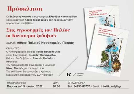 Στις νεροσυρμές του Πηλίου οι Κένταυροι ξεδιψούν | Παρουσίαση στην Πάτρα Οι Εκδόσεις Κοντύλι, η συγγραφέας Ελισάβετ Καπαγερίδου & η εικαστικός Αθηνά Μιχοπούλου σας προσκαλούν την Παρασκευή 3 Ιουνίου 2022 και ώρα…28 Μαΐου 2022 -