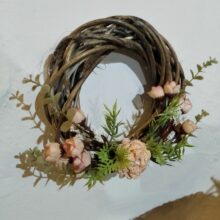 Διακοσμητικό στεφάνι μπαμπού στολισμένο με χειροποίητα πλεκτά λουλούδια και συνθετικά ανθάκια.