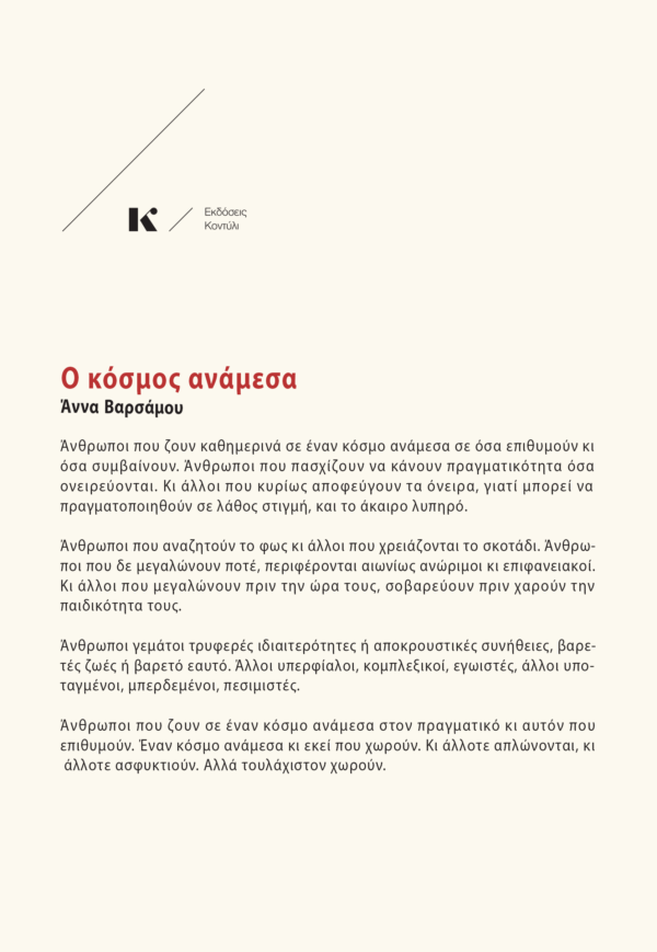 Άνθρωποι που ζουν σε έναν κόσμο ανάμεσα στον πραγματικό κι αυτόν που επιθυμούν. Έναν κόσμο ανάμεσα κι εκεί που χωρούν. Κι άλλοτε απλώνονται, κι άλλοτε ασφυκτιούν. Αλλά τουλάχιστον, χωρούν.